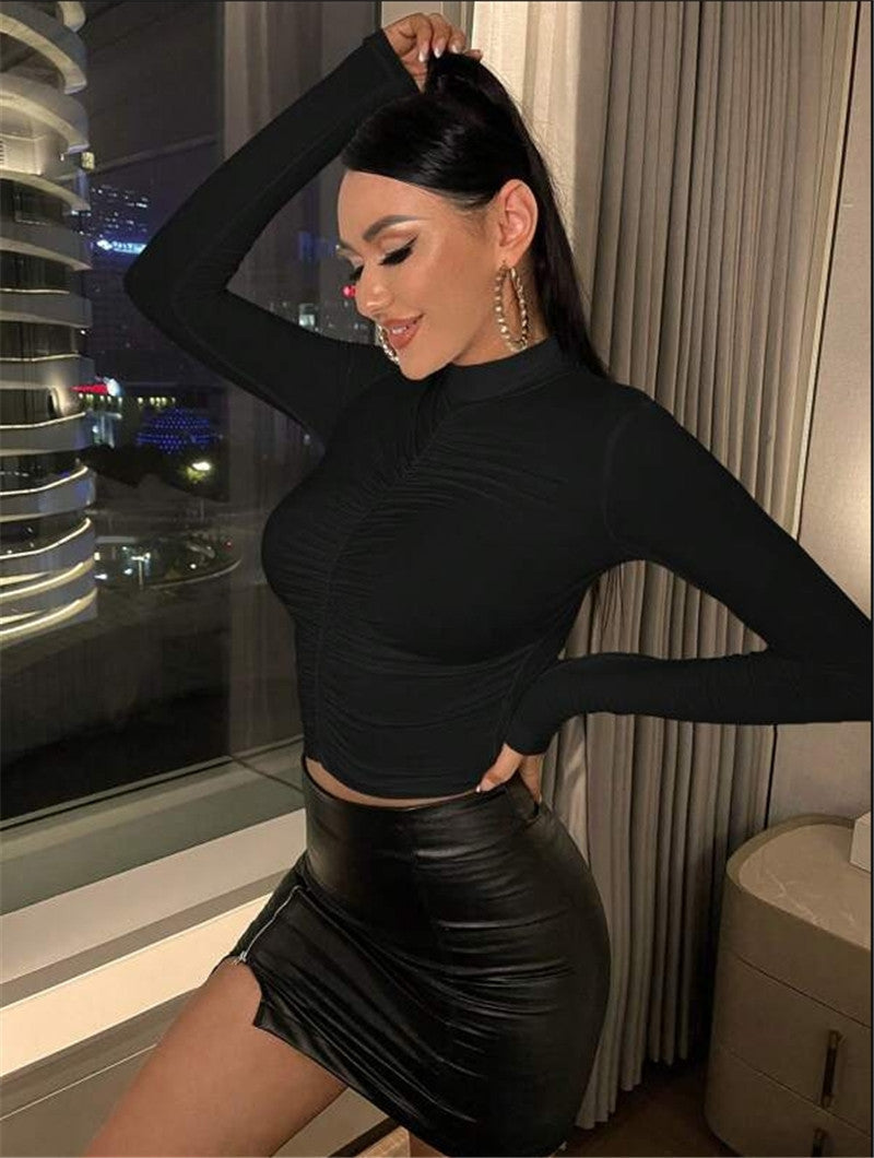 Autumn/Winter Slim Fit Versatile Ruched Mock Neck T-Shirt